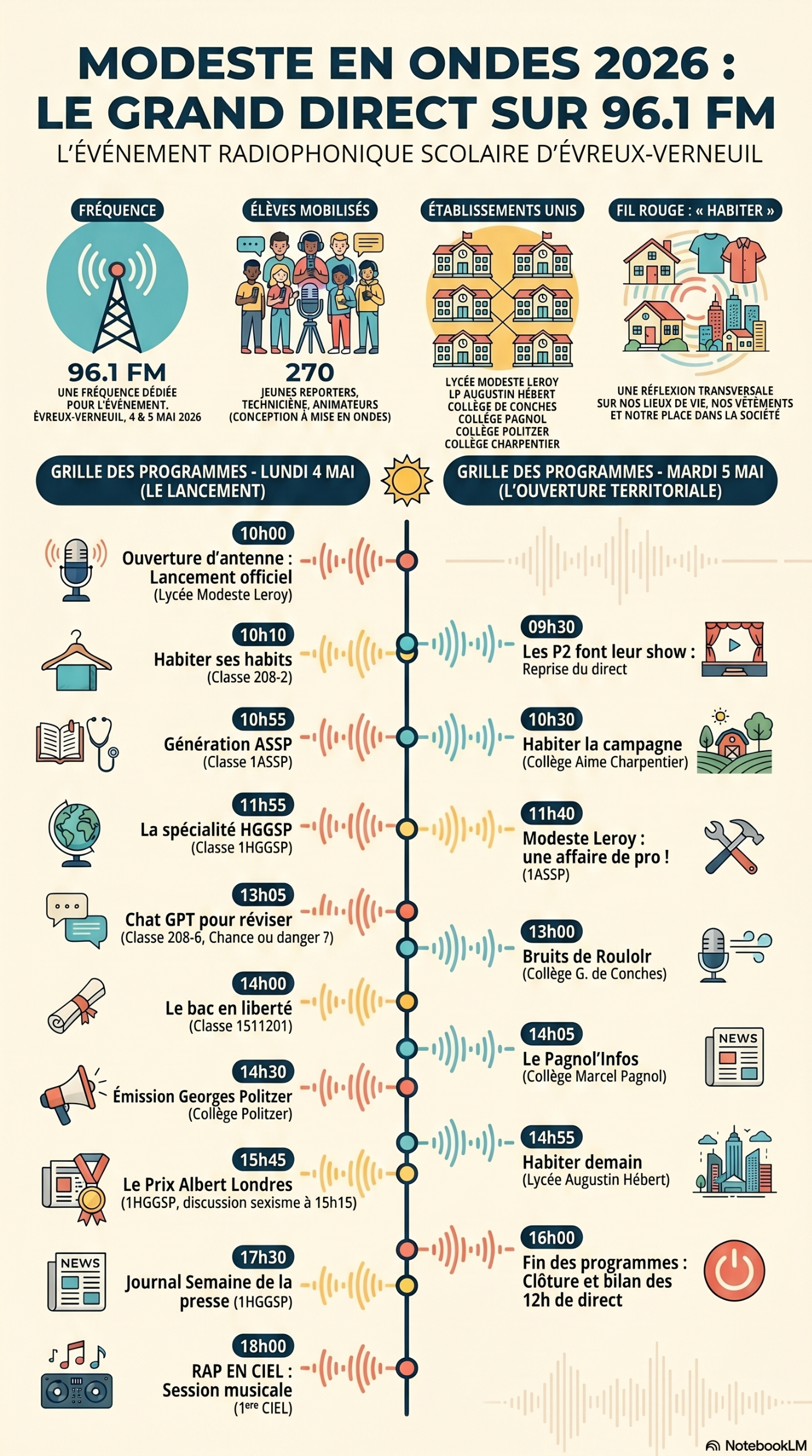 Ce projet est le fruit d’une résidence radio avec l’association Zones d’Ondes, permettant à près de 270 élèves de s’initier aux métiers du journalisme et de la technique. Outre les émissions de plateau, les auditeurs pourront découvrir des reportages, des micro-trottoirs et des dédicaces musicales préparés tout au long de l’année.